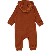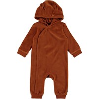 Forest är en brun velourbody med en sned knappstängning framtill samt en luva med små påsydda öron.