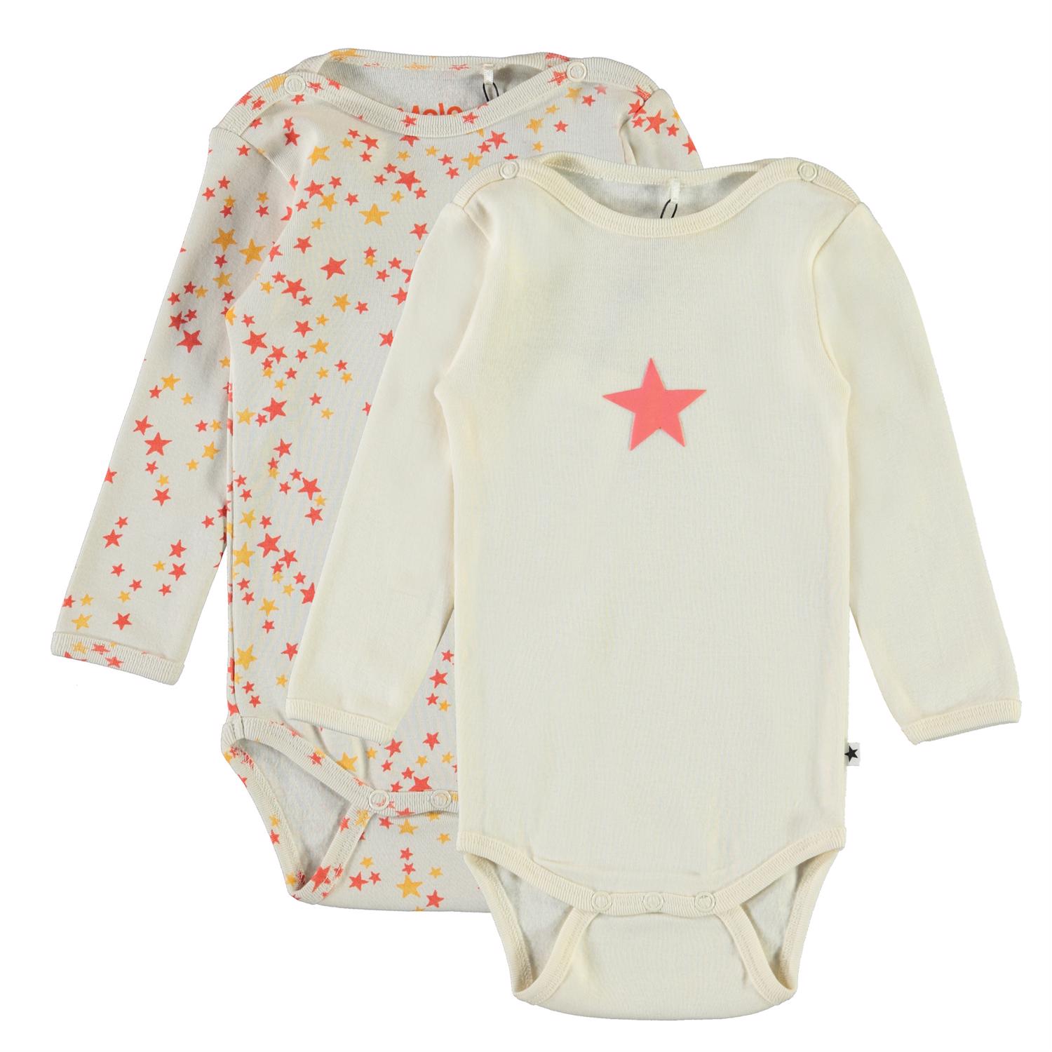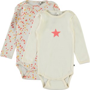 Foss är en långärmad body. Här är Foss i 2-pack, som innehåller både en pärlemorfärgad body och en med stjärntryck. Tryckknappar i nacken och mellan benen gör det enkelt att ta av och på bodyn.Certifierad av Ecocert Greenlife, certifiering nr. 197496.