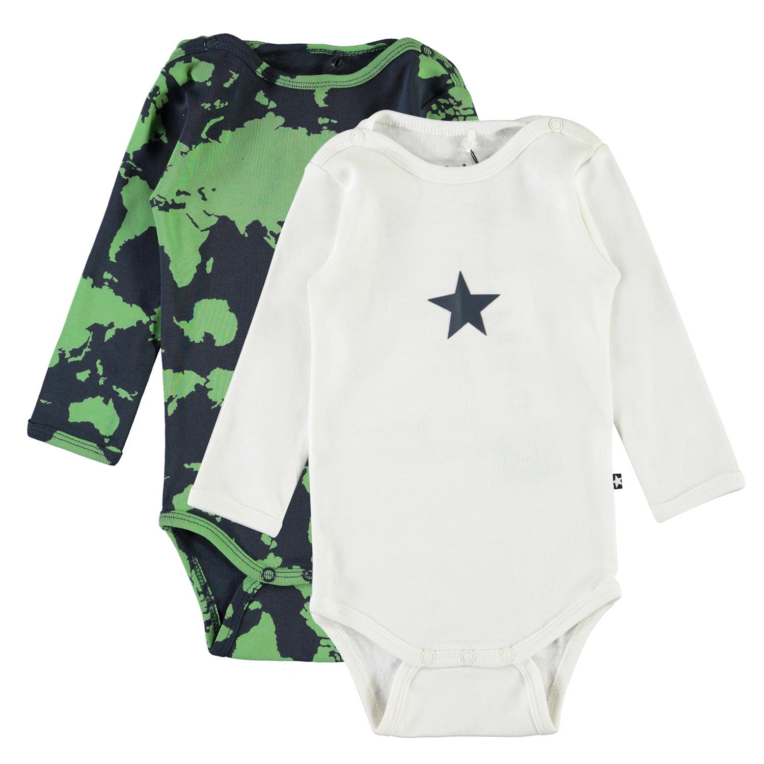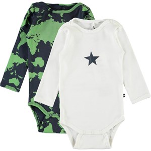 Foss är en långärmad body. Här är Foss i 2-pack, som innehåller både en vit och en mösntrad babybody. Tryckknappar i nacken och mellan benen gör det enkelt att ta av och på bodyn.Certifierad av Ecocert Greenlife, certifiering nr. 197496.
