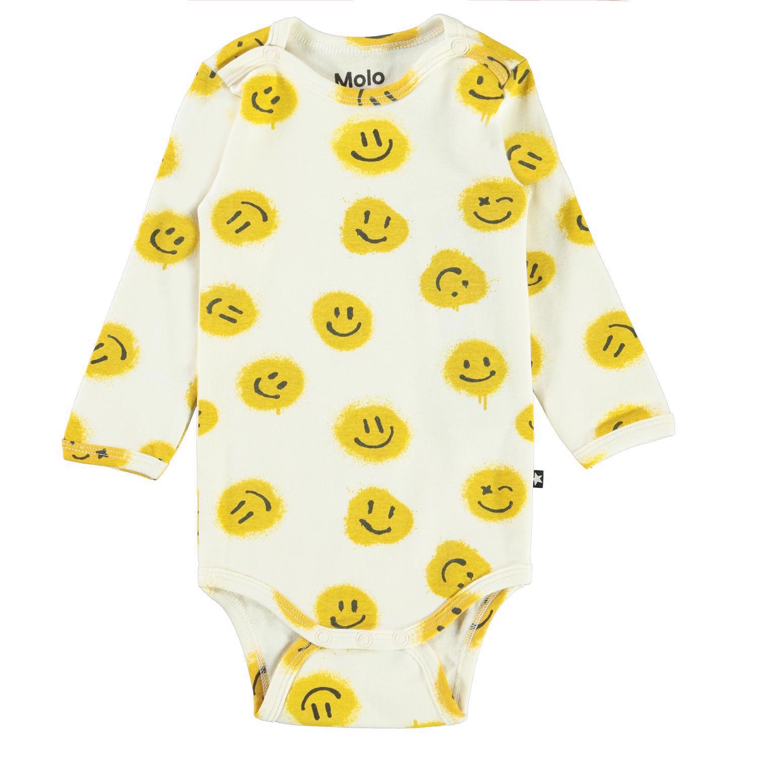 Foss är en långärmad cremefärgad babybody med gula smileys. Tryckknappar vid hals och mellan benen gör den enkel att ta av och på. Kombinera med matchande byxor.