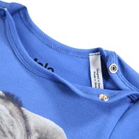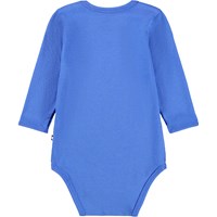 Blå långärmad body för de små i ekologisk bomull med en babyelefant. Bodyn har knäppning på axlarna och mellan benen för enkel på- och avklädning.