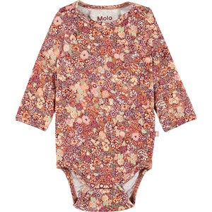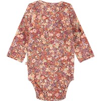 Foss är en småblommig babybody i röda nyanser. Foss har tryckknappar vid kragen och mellan benen, vilket gör den enkel att ta av och på.