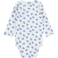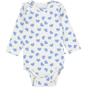 Foss är en vit babybody med blå hjärtan. Foss har tryckknappar vid kragen och mellan benen, vilket gör den enkel att ta av och på.