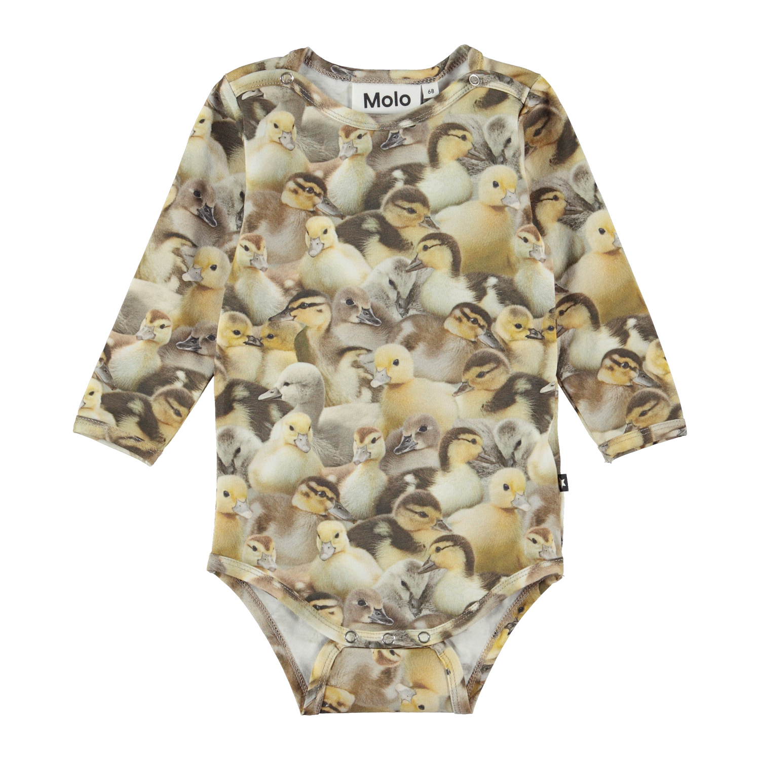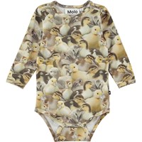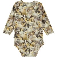 Foss är en babybody med söta ankungar i gula och bruna nyanser. Foss har tryckknapp i kragen och mellan benen, vilket gör den enkel att ta av och på.