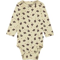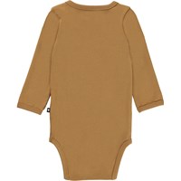 Foss är en brun babybody med en smiley på. Foss har trcykknappar vid kragen och mellan benen, vilket gör den enkel att ta av och på.