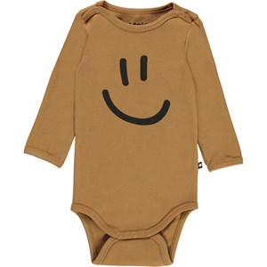Foss är en brun babybody med en smiley på. Foss har trcykknappar vid kragen och mellan benen, vilket gör den enkel att ta av och på.