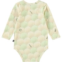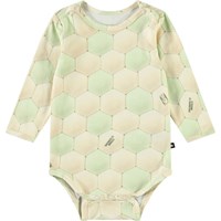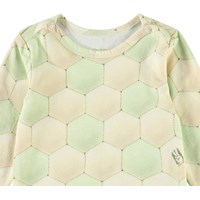 Långärmad body i ekologisk bomull för de små. Bodyn har fina kanter och knappar på axlarna och mellan benen för enkel påklädning. Denna body har ett mönster av fotbollar i beige och ljusgröna nyanser.