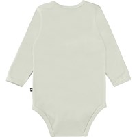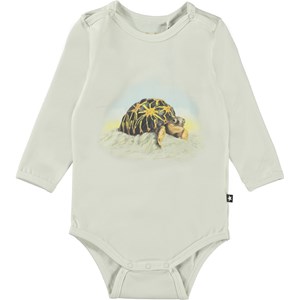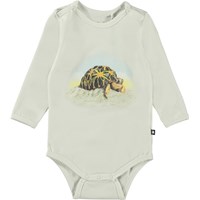 Foss är en grå babybody med en glad sköldpadda framtill. Foss har tryckknapp i kragen och mellan benen, vilket gör den enkel att ta av och på.