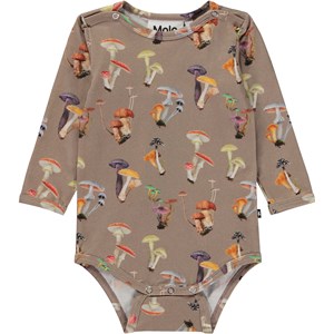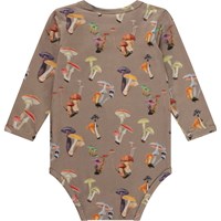 Gråbrun babybody med utvalda vackra svampar efter en höstpromenad i skogen, grafiskt, vackert och enkelt. Denna body är tillverkad i 100% bomull, har långa ärmar och tryckknappar i kragen och mellan benen, vilket gör den enkel att ta av och på. Matcha ev. bodyn med byxorna, Seb, i samma mönster.