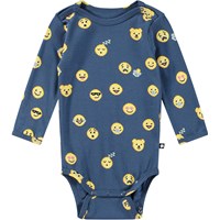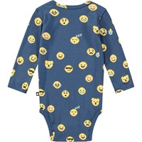Mörkblå långärmad body i ekologisk bomull. Bodyn har tryckknappar vid kragen och mellan benen, vilket gör det enkelt att ta av och på den. Den har ett all-over tryck av bedårande pixel-emojis.