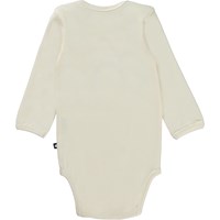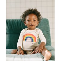 Här är en ljus babybody med regnbågsbroderi på bröstet. Bodyn har tryckknapp i halsen och mellan benen, vilket gör den enkel att ta av och på