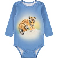 Blå, långärmad body för de små i ekologisk bomull med tigermönster. Bodyn har kantband och tryckknappar på axlarna och mellan benen för enkel på- och avklädning.