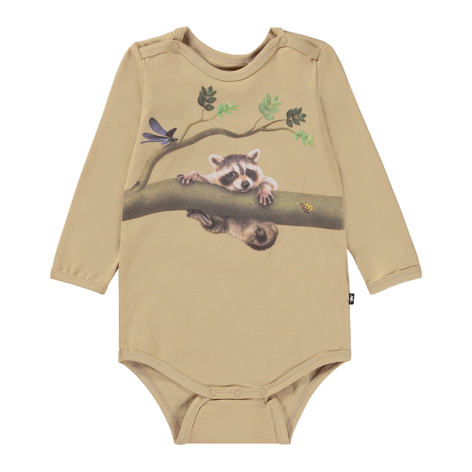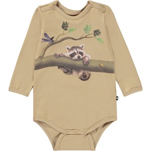 Beige babybody med en liten tvättbjörnsunge som försöker krypa upp på en gren. Kanske vill han upp till sin vän. Denna body är tillverkad i 100% bomull, har långa ärmar och tryckknappar i kragen och mellan benen, vilket gör den enkel att ta av och på. Matcha ev. bodyn med byxorna, Seb, i samma mönster.
