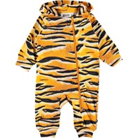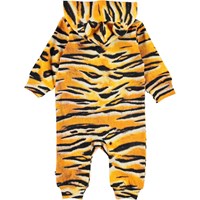 Fowo är en heldräkt till baby i gult och orange tigermönster. Fowo har luva och sned dragkedja framtill.