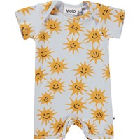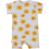 Free är en ljusblå babydräkt med små glada solar. Dräkten har korta ärmar och ben. Tryckknappar vid hals och mellan benen gör den enkel att få av och på.