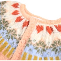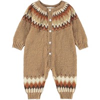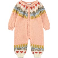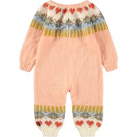 Rosa babyoverall tillverkad av mjuk alpackaull med nordisk-inspirerat mönster. Babyoverallen har långa ärmar och ben samt en praktisk knappstängning framtill och är perfekt för att hålla sig varm under kalla dagar.