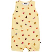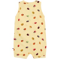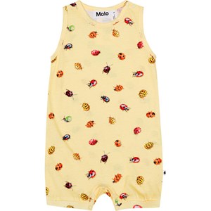Gul babydräkt i ekologisk bomull. Dräkten är uyan ärmar och har korta ben, så den passar perfekt till varma sommardagar. Tryckknappar vid hals och mellan benen gör den enkel att ta av och på. Dräkten har färgrika nyckelpigor och sniglar.