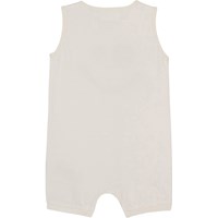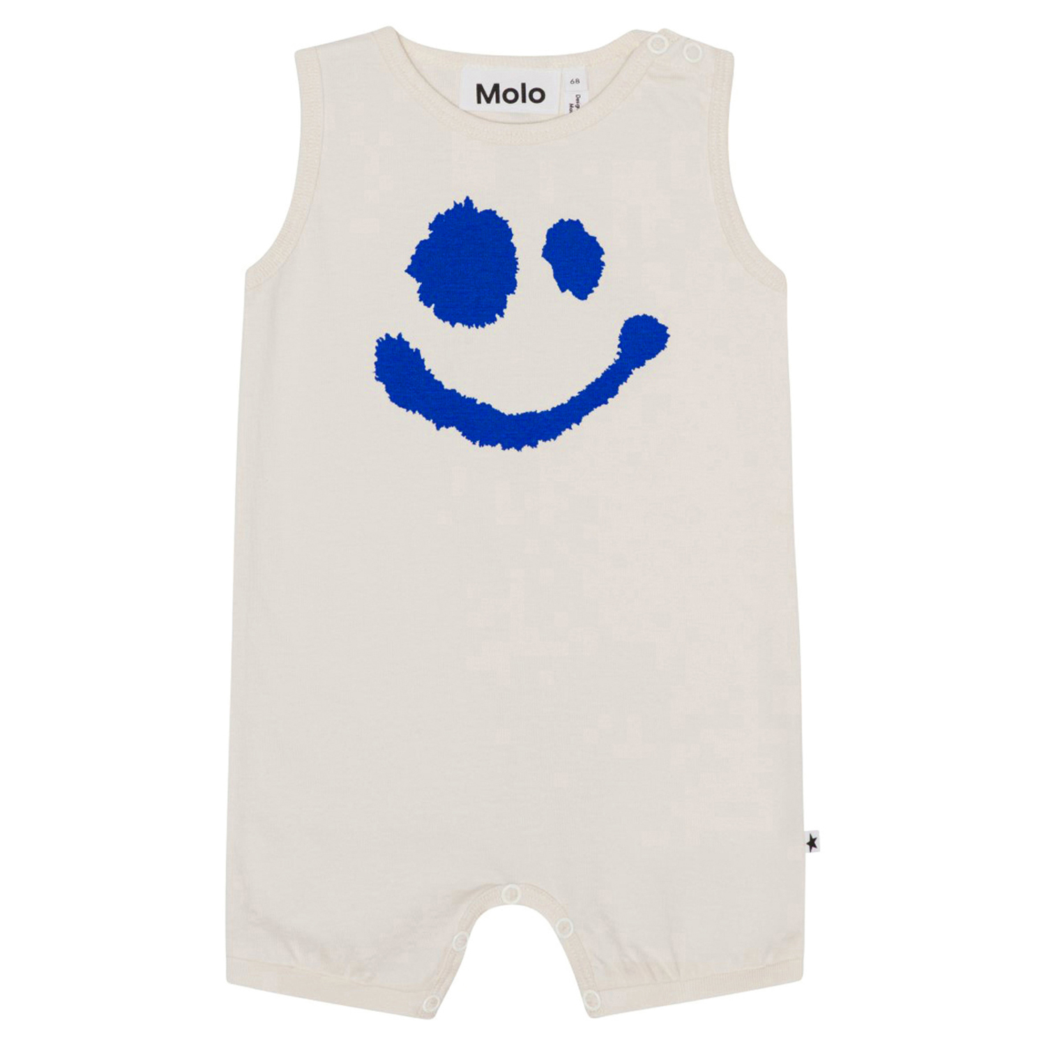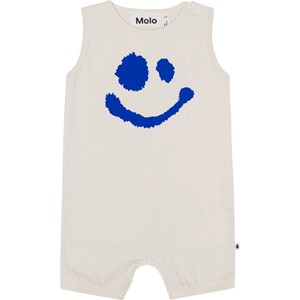 Vit babydräkt i ekologisk bomull. Dräkten är uyan ärmar och har korta ben, så den passar perfekt till varma sommardagar. Tryckknappar vid hals och mellan benen gör den enkel att ta av och på. Dräkten har en blå smiley framtill.