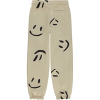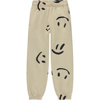 Beige sweatpants med stora svarta smileys. Dessa byxor är tillverkade i 100% bomull, har gummiband och invändigt knytband i midjan, gummiband vid anklarna och fickor i sidorna. Byxorna har en normal passform. Matcha ev. dessa byxor med trljan, Monti, samma mönster för det perfekta setet.