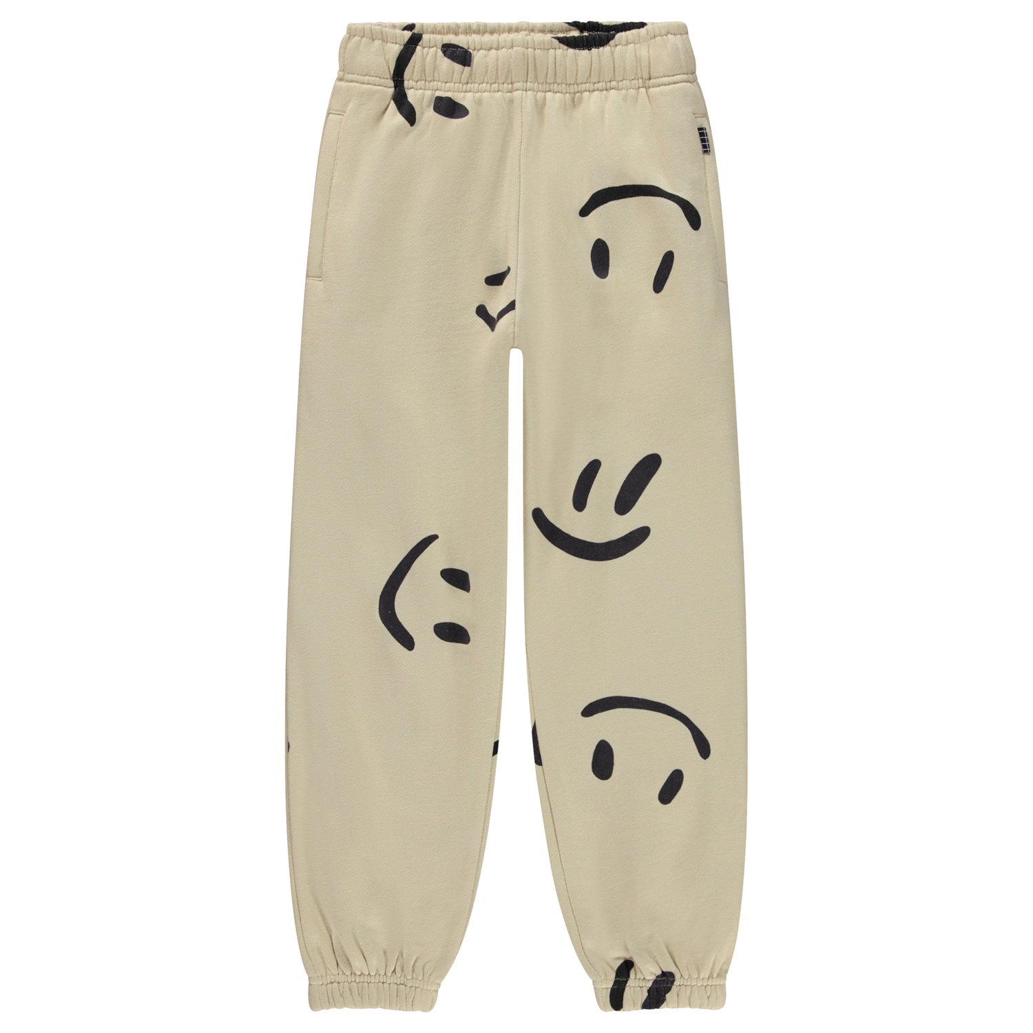 Beige sweatpants med stora svarta smileys. Dessa byxor är tillverkade i 100% bomull, har gummiband och invändigt knytband i midjan, gummiband vid anklarna och fickor i sidorna. Byxorna har en normal passform. Matcha ev. dessa byxor med trljan, Monti, samma mönster för det perfekta setet.