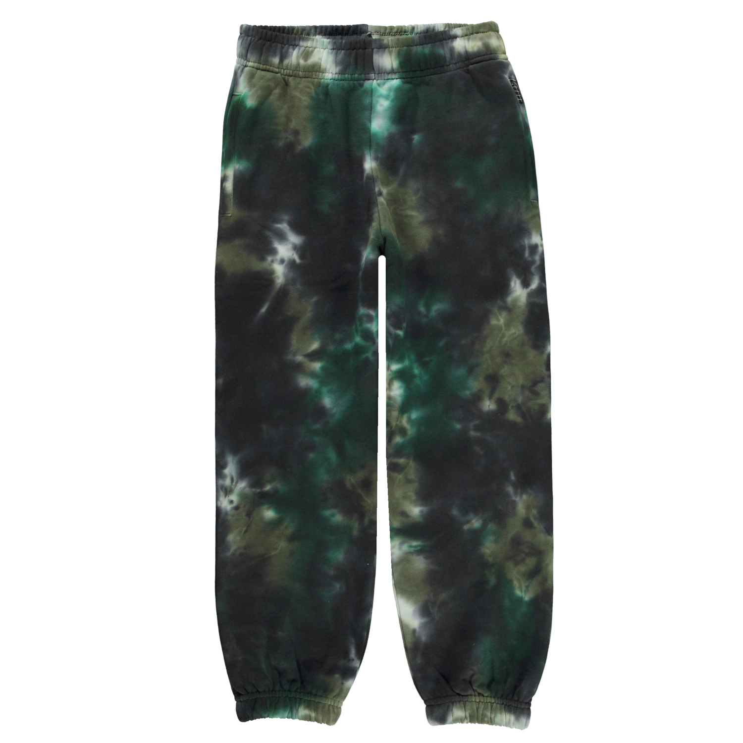 Gröna sweatpants med tie-dye i olika gröna nyanser. Dessa byxor är tillverkade i 100% bomull, har gummiband och invändigt knytband i midjan, gummiband vid anklarna, fickor i sidorna och en bakficka. Byxorna har en normal passform. Molo´s tie-dye är handgjort och kan därför variera från plagg till plagg.