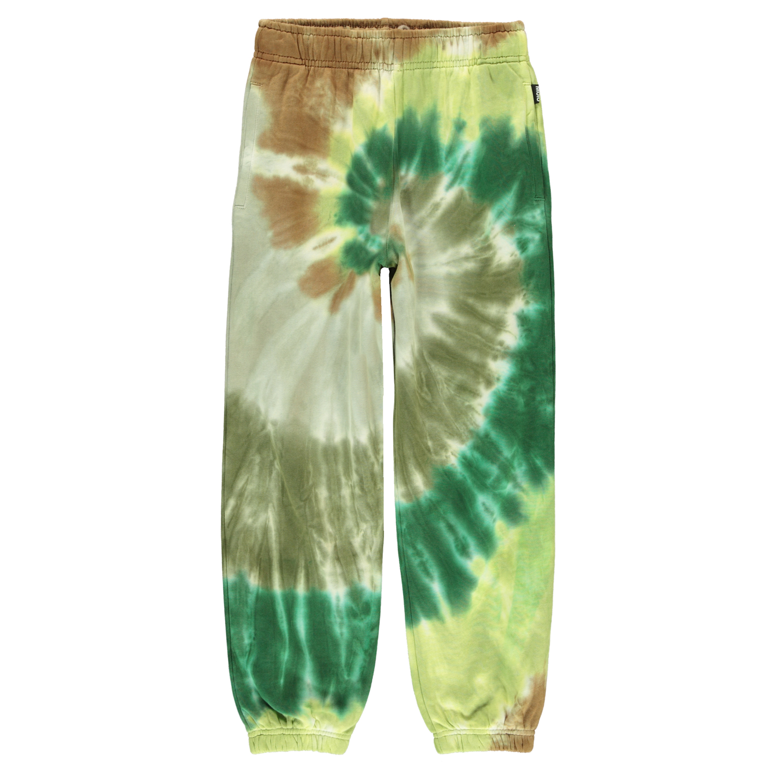 Adan är ett par unisex sweatpants med grönt och brunt tie-dy mönster, som bildar en spiral. Byxorna har gummiband vid benslut och i midjan, samt fickor framtill och en enkel påsydd ficka bak.