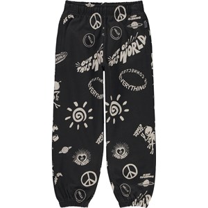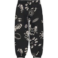 Svarta sweatpants med beigt mönster. Här ses olika element från kollektionen, säg hej till dansande aliens, den skinande solen, alla planeter, slieys, bankande hjärtan och peacetecken. Vilken fest! Dessa byxor är tillverkade i 100% bomull, har gummiband och invändigt knytband i midjan, gummiband vid anklarna och fickor i sidorna. Byxorna har en normal passform. Matcha ev. dessa byxor med rröjan, Monti, i samma mönster, för det perfekta setet.