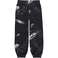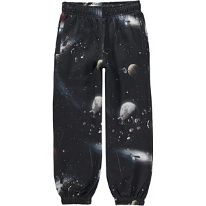 Mörkblå sweatpants där du kan se djupt ut i rymden. Du kan se både planeter och stjärnor, men du kan ocksp se ännu längre, helt ut till de nya galaxerna och svarta hålen, där äventyren väntar. Dessa byxor är tillverkade i 100% bomull, har gummiband och invändigt knytband i midjan, gummiband vid anklarna, fickor i sidorna och en bakficka. Byxorna har en normal passform.