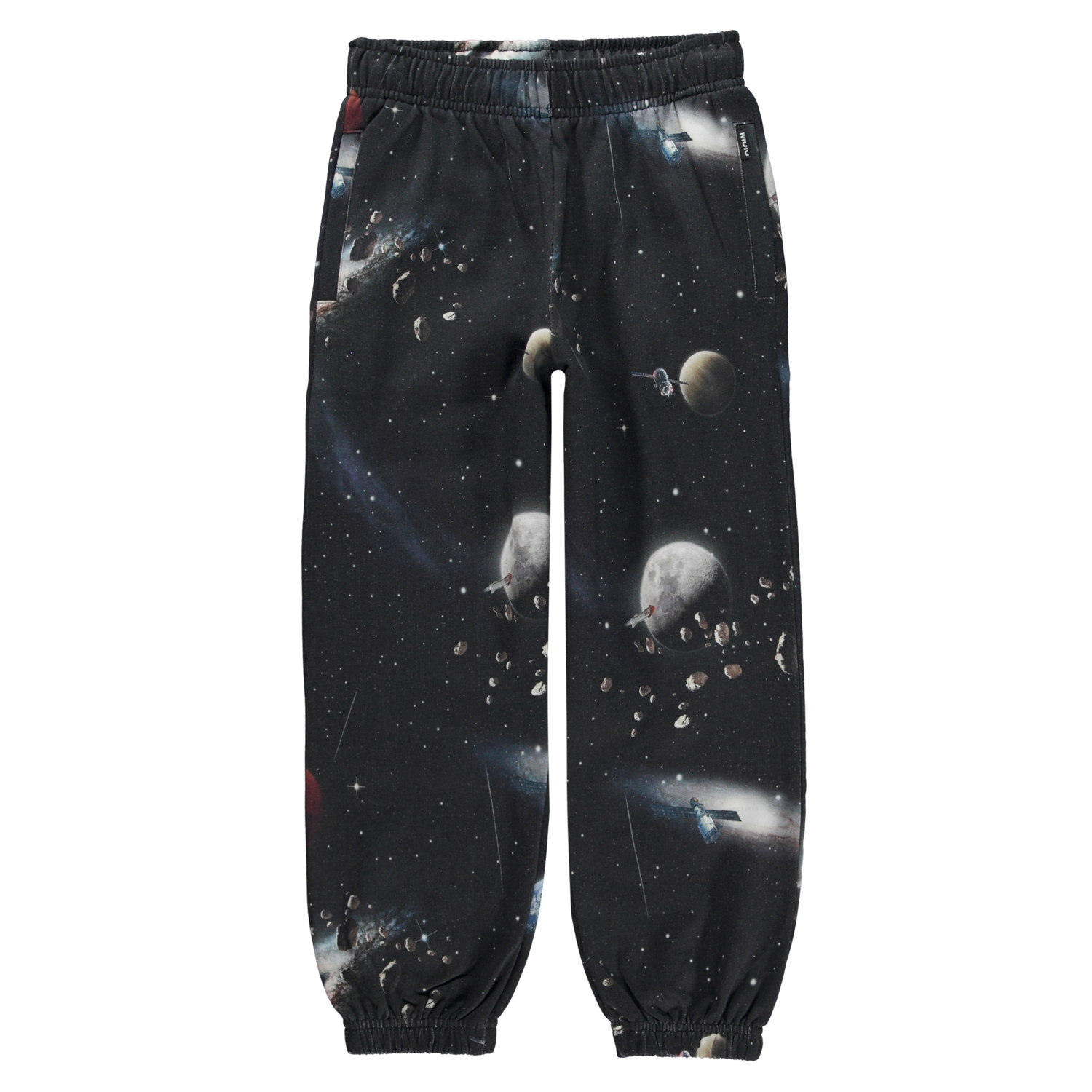 Mörkblå sweatpants där du kan se djupt ut i rymden. Du kan se både planeter och stjärnor, men du kan ocksp se ännu längre, helt ut till de nya galaxerna och svarta hålen, där äventyren väntar. Dessa byxor är tillverkade i 100% bomull, har gummiband och invändigt knytband i midjan, gummiband vid anklarna, fickor i sidorna och en bakficka. Byxorna har en normal passform.