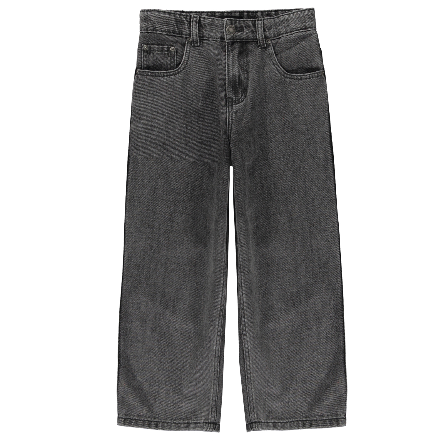 Mörkgrå jeans i en bomull/viskos blandning med långa ben och en lös passform. Byxornas midja kan justeras med invändigt gummiband, så att de passar perfekt till alla barn. Storlek 92-134 har tryckknapp så att byxorna är enkla att at av och på - storlek 140-176 har vanlig jeansknapp.