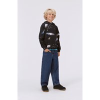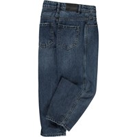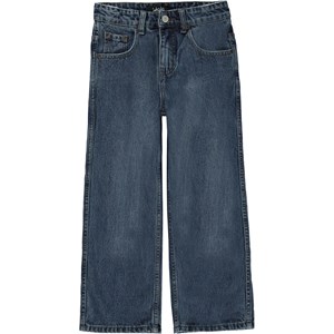 Blå jeans i en mörk tvätt. Dessa jeans är tillverkade i 100% bomull, har långa ben och en lös passform. Byxornas midja kan justeras med invändigt gummiband, så att de passar perfekt till alla barn. Storlek 92-134 har tryckknapp så att byxorna är enkla att ta av och på - storlek 140-176 har vanlig jeansknapp. Huvuddelen av detta plagg är tillverkade av ekologisk bomull.