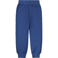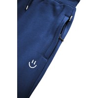 Blå sweatpants i ekologisk bomull med resår i midjan, invändig dragsko, dragkedjefickor och muddar vid anklarna. Sweatpantsen har en normal passform och en liten broderad smiley vid fickan. Den borstade insidan gör dem mjuka och varma att bära.