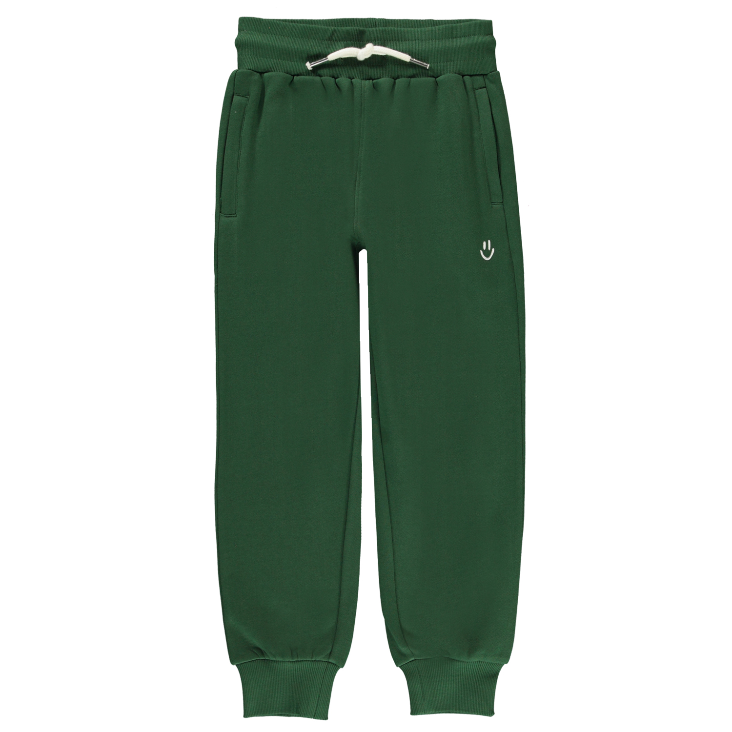 Alvar är ett par sportia sweatpants i grön med en liten smiley vid ena fickan fram. Byxorna har brett gummiband i midjan och fickor med dragkedja.