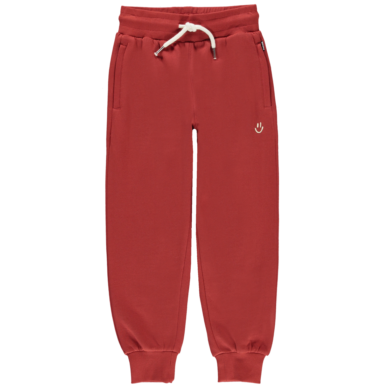 Alvar är ett par sportiga sweatpants i röd med en liten smiley vid ena fickan fram. Byxorna har brett gummiband i midjan och fickor med dragkedja.