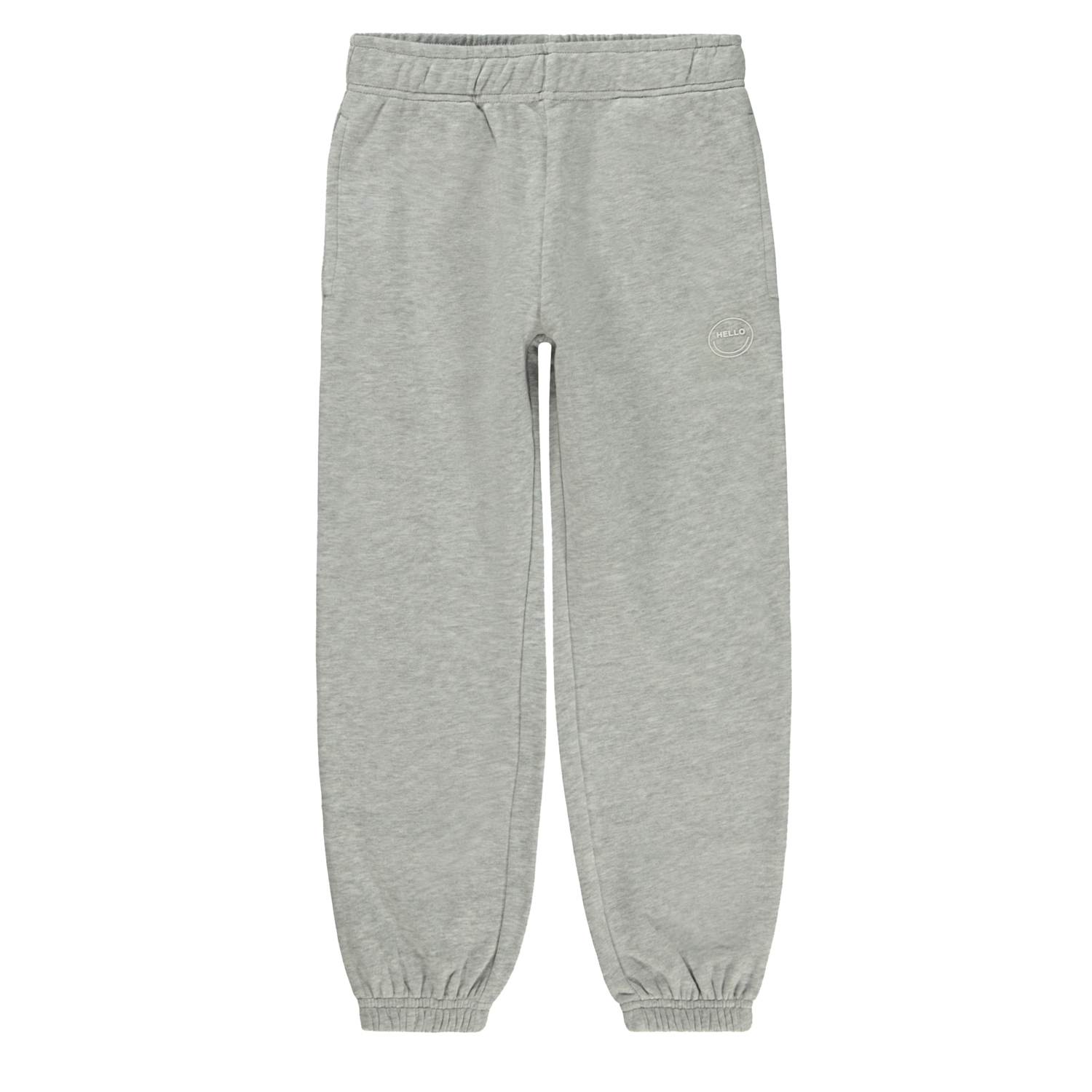 Am är ett par ljusgrå unisex sweatpants med gummiband i midjan och vid benslut.