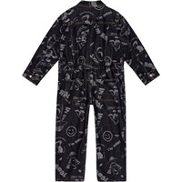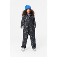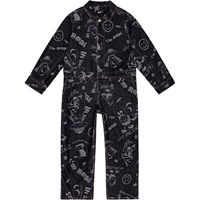 Svart denimoverall med mönster över hela. Overallen har långa ärmar och ben och en lös passform. Den har en tryckknappar och påsydda fram- och bakfickor. Mönstret är en jacquardvävd design på tvättad svart denim. Den har olika tecknade figurer, som en utomjording som letar efter snacks och lyfter upp bananer i sitt UFO, en katt med en datorskärm som huvud, som tittar på en datormus, och en utomjording som bär en VR-headset. Mönstret är livligt och har många roliga detaljer. Byxornas midja kan justeras med en invändig resår, vilket garanterar en perfekt passform för alla barn.