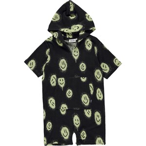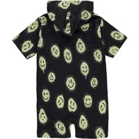 Mason är en svart dräkt i frotté med gula smileys. Dräkten har luva, korta ärmar och ben och är perfekt till stranden efter en tur i vattnet.