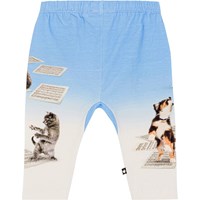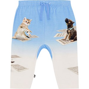 Blå byxor med mönster till baby i ekologisk bomullsjersey. Byxorna har en lös passform, gummiband med knytband i midjan som gör dem enkla att ta av och på. Byxornas mönster är dansande hundar och katter på deras noter.