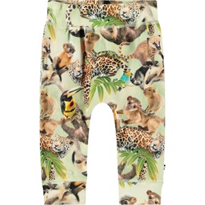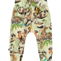 Byxor i ekologisk bomullsjersey för de små. Byxorna har en bred elastisk ribbstickad midja och muddar, samt synliga sömmar på framsidan, vilket ger dem en byxlook. De är mjuka att bära och ger gott om utrymme för rörelse. Byxorna har ett mönster med djungeldjur. För en komplett outfit, matcha med en matchande topp.