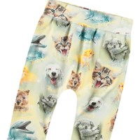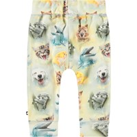 Byxor i ekologisk bomullsjersey för de små. Byxorna har en bred elastisk resår i midjan och muddar, samt synliga sömmar framtill, vilket ger dem en byxlook. De är mjuka att bära och ger gott om utrymme för rörelse. Byxorna har ett mönster med leende djur. För en komplett outfit, matcha med en matchande body.