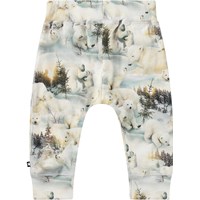 Lösa byxor för de små gjorda av ekologisk bomullsjersey. Byxorna har en bred elastisk ribbstickad midja och muddar, samt synliga sömmar framtill som ger dem en sweatpants-look. De är mjuka att ha på och ger gott om utrymme för rörelse. Byxorna har ett heltryckt mönster med massor av isbjörnar som leker i snön och har roligt.