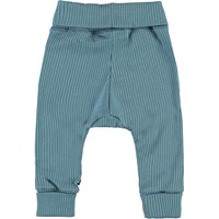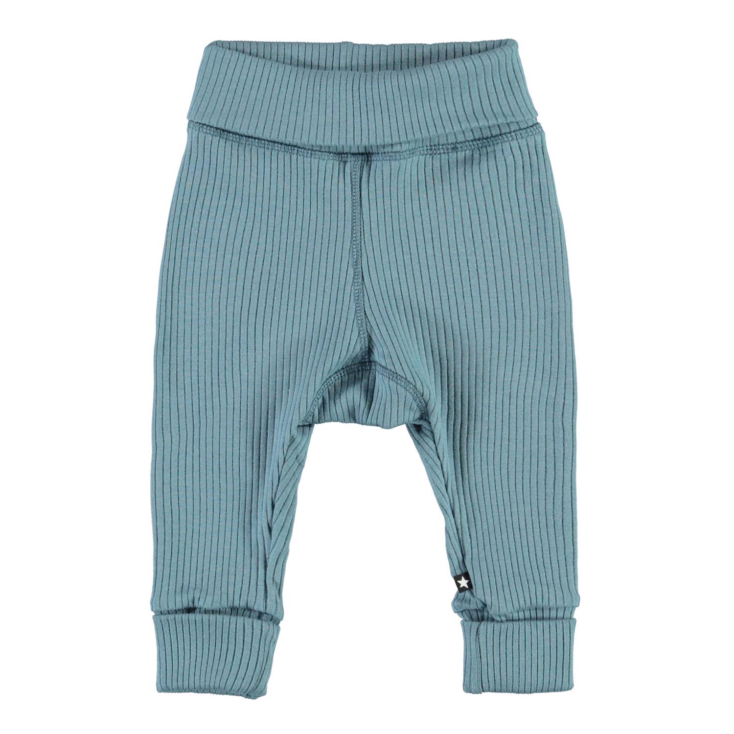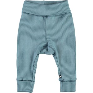 San är ett par ljusblå ribbade babybyxor. Byxorna har en bred elastisk midja och uppvikta ben. Kombinera byxorna med en matchande tröja. Denna Molo-produkt är tillverkad av 100% ekologisk bomull.