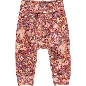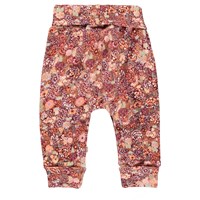 San är ett par röda babybyxor med blommigt mönster. Byxorna har brett gummiband i midjan och vid benslut. Kombinera byxorna med matchande tröja.