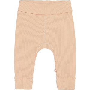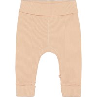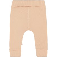 San är ett par rosa babybyxor i ribb. Byxorna har brett gummiband i midjan och vid benlut, och båda är uppvikta. Kombinera med matchande överdel.