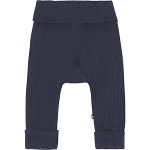 San är ett par blå babybyxor i ribb. Byxorna har brett gummiband i midjan och vid benlut, och båda är uppvikta. Kombinera med matchande överdel.