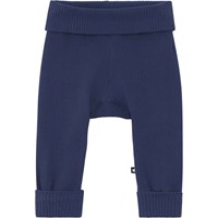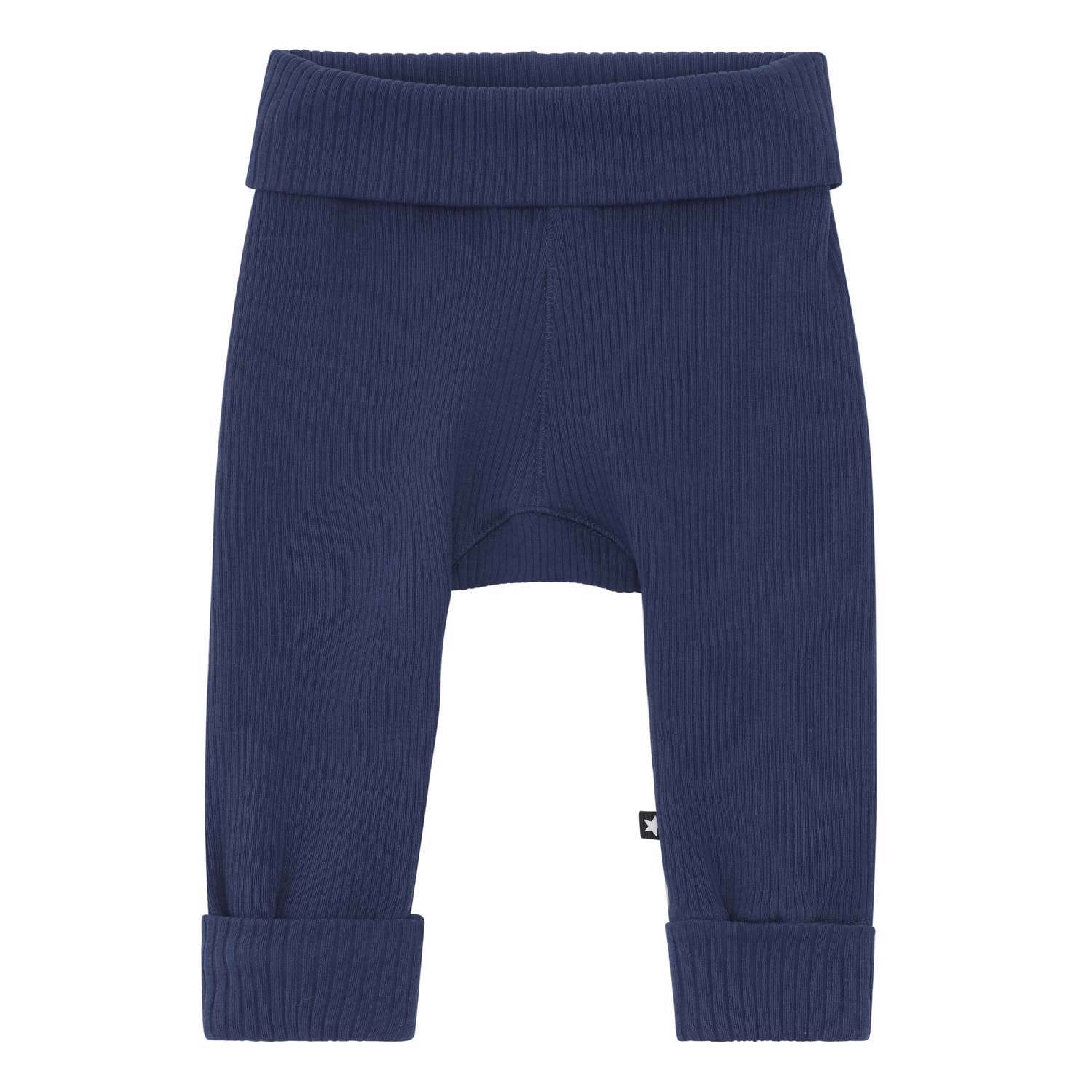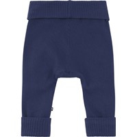 San är ett par ekologiska blå babybyxor. Byxorna har bred gummibandskant i midjan och vid benslut som båda är vikta.