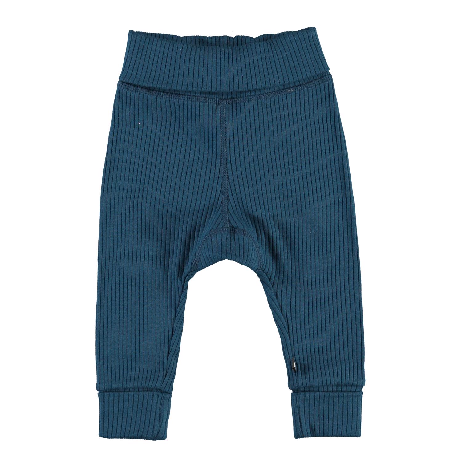 San är ett par mörkblå ribbade babybyxor. Byxorna har en bred elastisk midja och uppvikta ben. Kombinera byxorna med en matchande tröja. Denna Molo-produkt är tillverkad av 100% ekologisk bomull.