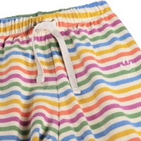Mjuka byxor för de små i ekologisk bomull med regnbågsränder. De har en lös passform samt resår och dragsko i midjan som gör dem lätta att ta på och av och bekväma att röra sig i.
