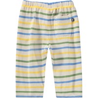 Mjuka byxor för de små i ekologisk bomull med blå, gröna och gula ränder. De har en lös passform samt resår och dragsko i midjan vilket gör dem lätta att ta på och av och bekväma att röra sig i.