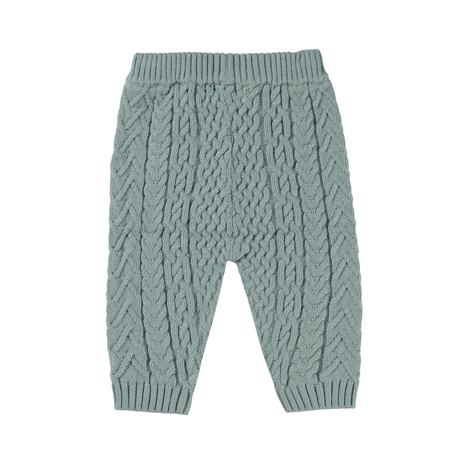 Svagt gröna kabelstickade byxor till de minsta. Dessa byxor är tillverkade i en bomull/ull blandning, har långa ben och ribbstickning i både midjan och benslut. Matcha ev. dessa byxor med tröjan, Bjork, i samma kvalitet för det perfekta setet.